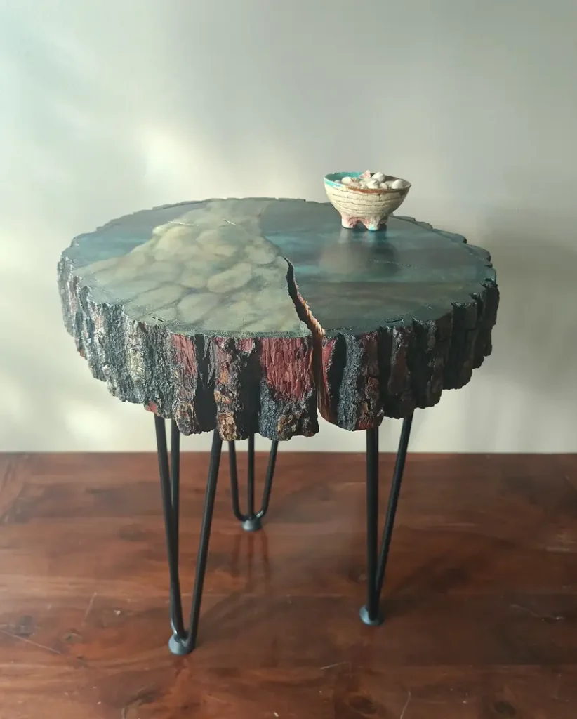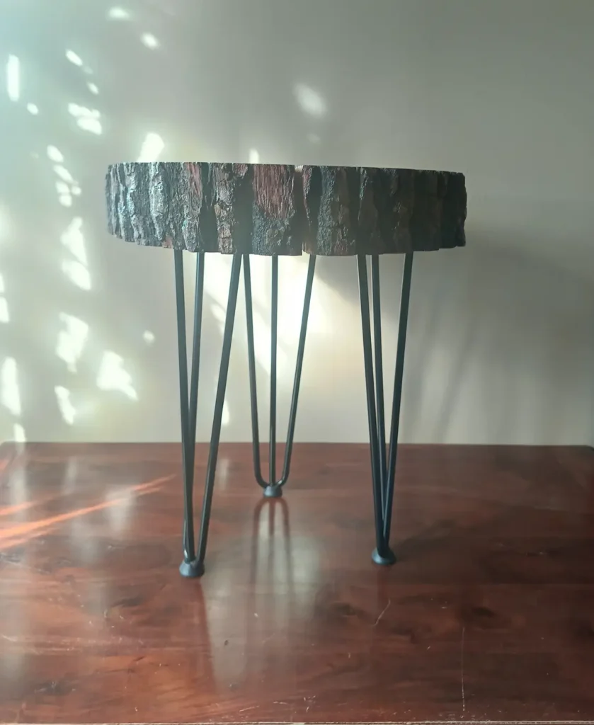 blat – dębowy plaster drewna z korą, zaimpregnowany 3 warstwami oleju,OSMO Top- Olej, High Solid, który nadaje bezbarwny jedwabisty połysk. Olej tworzy powłokę na bazie naturalnych olejów i wosków opracowanych specjalnie do drewnianych blatów kuchennych i mebli. Pozwala drewnu swobodnie oddychać, nie pęka, nie łuszczy się, ani nie odpryskuje. Pokryta nim powierzchnia jest odporna na zabrudzenia z wina, piwa, coli, kawy, herbaty, soków owocowych, mleka, wody itd. Po wyschnięciu ta ekologiczna powłoka jest bezpieczna dla ludzi, zwierząt i roślin (jest bezpieczną powłoką zabawek dziecięcych zgodnie z EN 71.3 oraz odporna na ślinę i pot zgodnie z DIN 53160). Została też dopuszczona do kontaktu z żywnością.